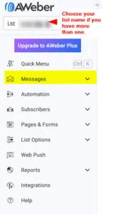 - Also, on the LH side, you’ll see the vertical ribbon with info about your mailing list — Messages, Subscribers, etc .
